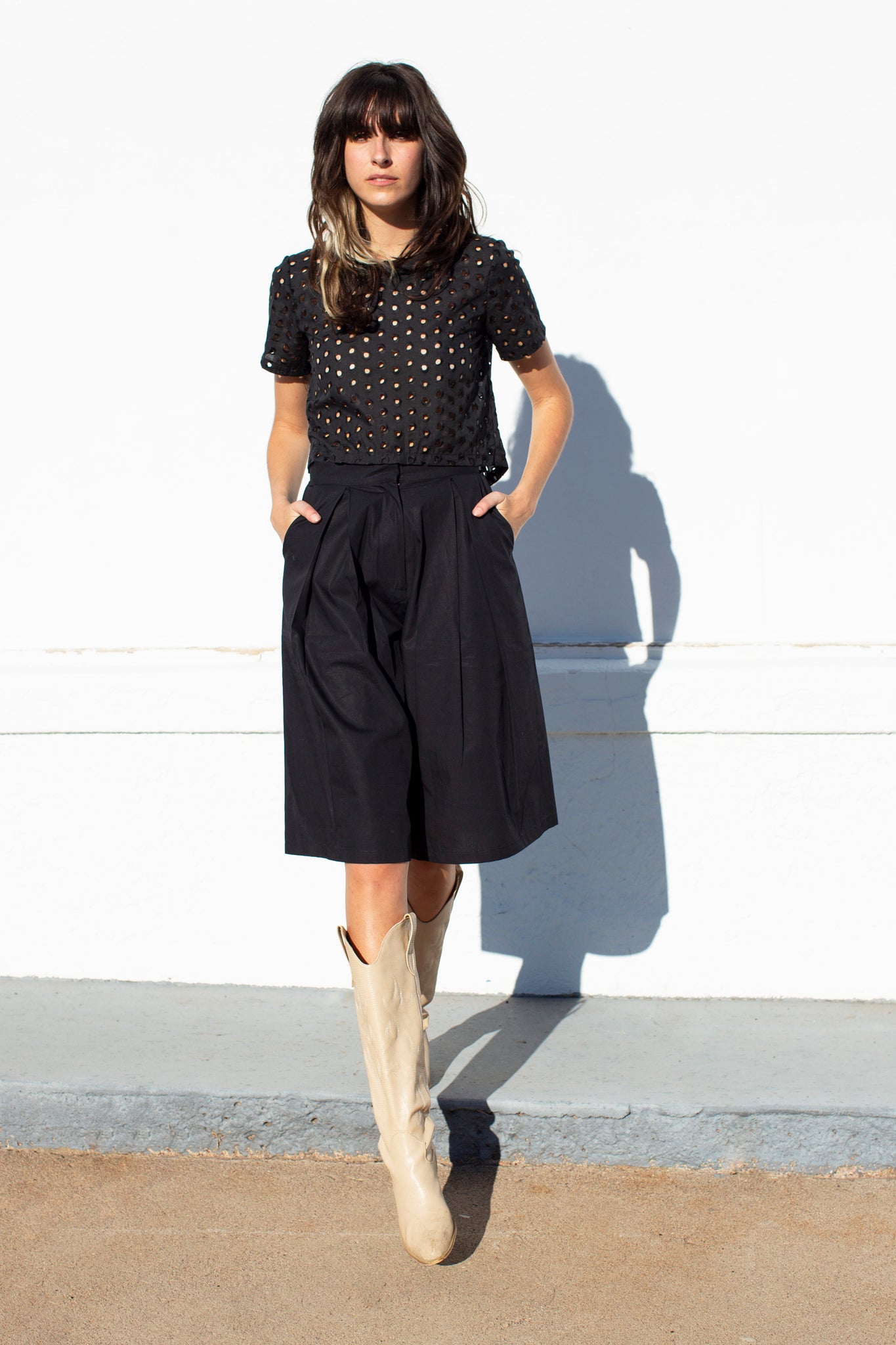 Boxy cropped top, longer in back than in front in breezy black cotton eyelet.